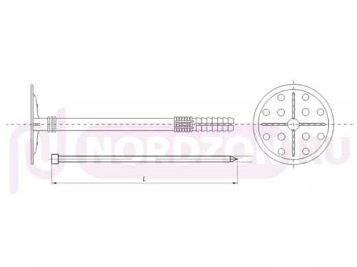 - Монтаж: фиксация дюбеля в стене производится путем забивания пластикового или металлического распорного гвоздя, на 1 кв.м монтируемой изоляции рекомендуется использовать 4-5 дюбелей. Для длины дюбеля 140 мм и более, а также для монтажа тяжелых конструкций рекомендуется применять металлический гвоздь