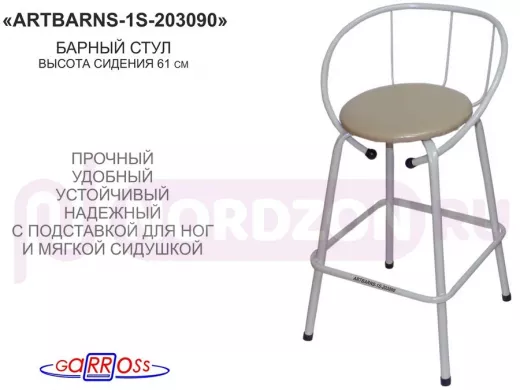 Барный стул "ARTBARNS-1S" органично дополнит интерьер модного заведения или домашней кухни. Стильная модель высотой 0,61 метра устойчиво стоит на четырех опорах с удобными подножками.