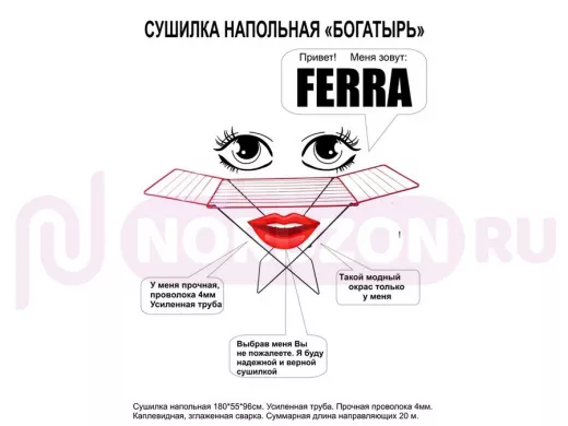 - "БОГАТЫРЬ" FERRA сушилка напольная КРАСНО-ЧЁРНАЯ 20 метров, предназначена для сушки белья