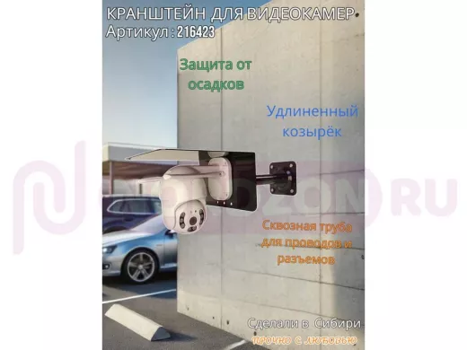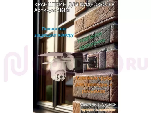 - Кронштейн для крепления видеокамеры к стене имеет сквозное отверстие от основания до козырька, что позволяет спрятать соединения кабеля, тем самым защищает их от внешних воздействий (дождь, снег, ветер) поэтому нет необходимости использовать дополнительный гермобокс, т.к. разъемы спрячутся в трубе.