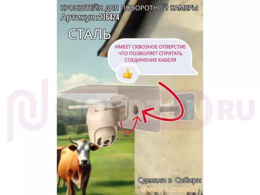 - Кронштейн для крепления видеокамеры к стене имеет сквозное отверстие от основания до козырька, что позволяет спрятать соединения кабеля, тем самым защищает их от внешних воздействий (дождь, снег, ветер) поэтому нет необходимости использовать дополнительный гермобокс, т.к. разъемы спрячутся в трубе.