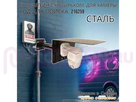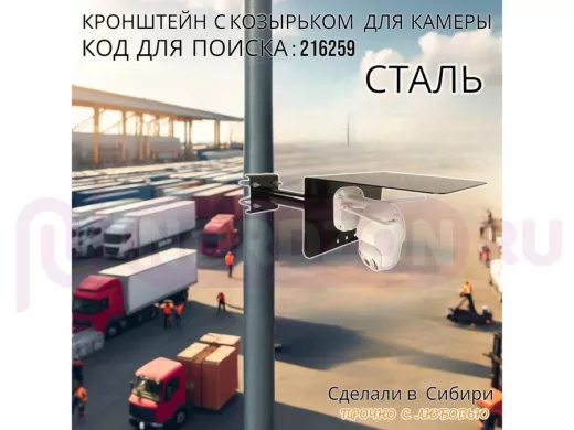 - Универсальный кронштейн с козырьком предназначен для крепления поворотной или цилиндрической камеры и прожектора на трубу.