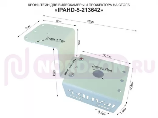 - С данным кронштейном нет необходимости в фиксации дополнительного крепежа под установку камеры и прожектора, все крепежные отверстия имеются на кронштейне. Три отверстия вверху диаметром 7мм и шагом 30мм и три внизу позволяют закрепить опции: водо-снего-солнце защитный козырёк (код товара: 90396) или светодиодный прожектор.
