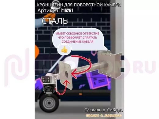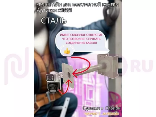 - Кронштейн для крепления видеокамеры на столб имеет сквозное отверстие, что позволяет спрятать соединения кабеля, тем самым защищает их от внешних воздействий (дождь, снег, ветер) поэтому нет необходимости использовать дополнительный гермобокс, т.к. разъемы спрячутся в трубе.