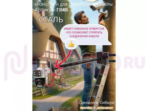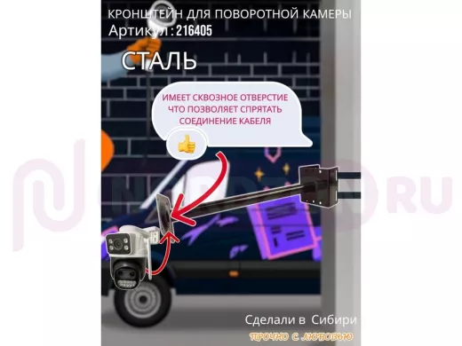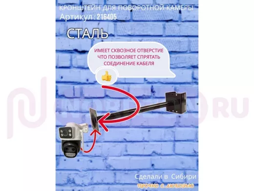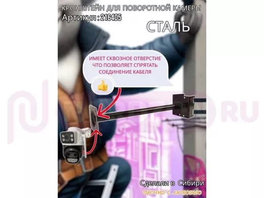 - Кронштейн для крепления видеокамеры на столб имеет сквозное отверстие, что позволяет спрятать соединения кабеля, тем самым защищает их от внешних воздействий (дождь, снег, ветер) поэтому нет необходимости использовать дополнительный гермобокс, т.к. разъемы спрячутся в трубе.