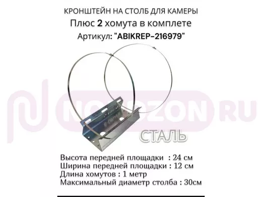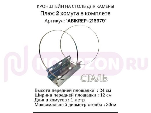 Кронштейн оцинкованный для камеры видеонаблюдения с хомутами на столб "ABIKREP-216979" 24х12см, 2отв