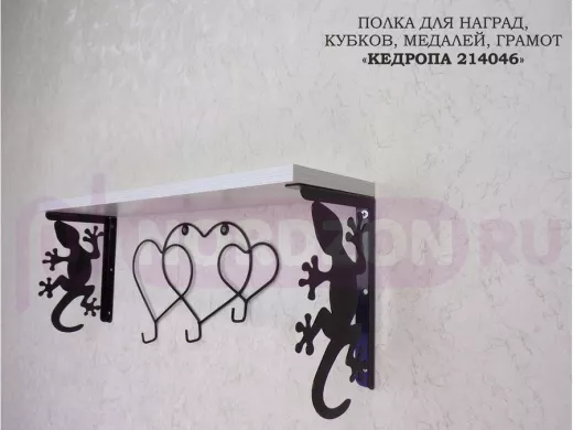 Заказать звонокПолка для наград, кубков, медалей, грамот "КЕДРОПА-214046 гекон"размер 15х60х24 см, сосна с сердцами