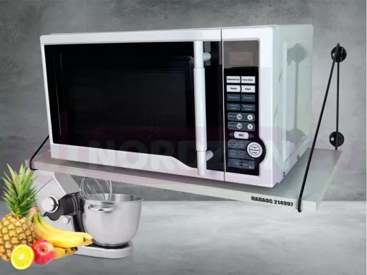 - Полка надежно крепится к стене при помощи анкеров или шурупов с дюбелями, на ней можно разместить микроволновую печь, кухонную технику, посуду, специи и многое другое