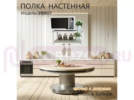 - Полка надежно крепится к стене при помощи анкеров или шурупов с дюбелями, на ней можно разместить микроволновую печь, кухонную технику, посуду, специи