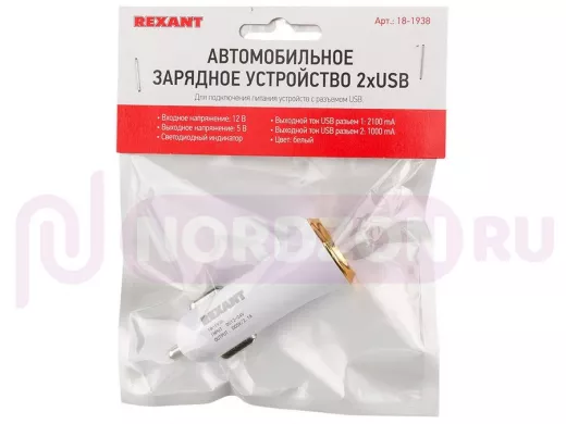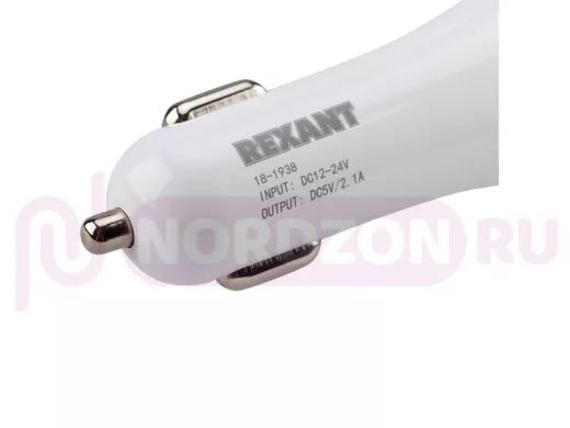Заказать звонокАвтомобильный адаптер REXANT 2хUSB с индикацией (АЗУ) (1000+2100 mA) белая