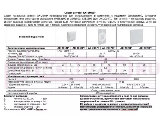 Универсальная антенна AX-2014PF предназначена для использования в комплекте c 3G/4G модемами (роутерами), репитерами стандартов 3G.