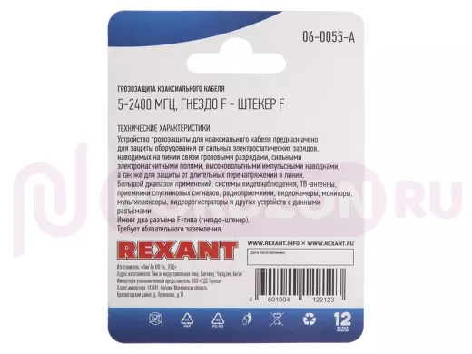 Заказать звонокГрозозащита коаксиального кабеля 5-2400 МГц, (гнездо F - штекер F), (1шт.) REXANT