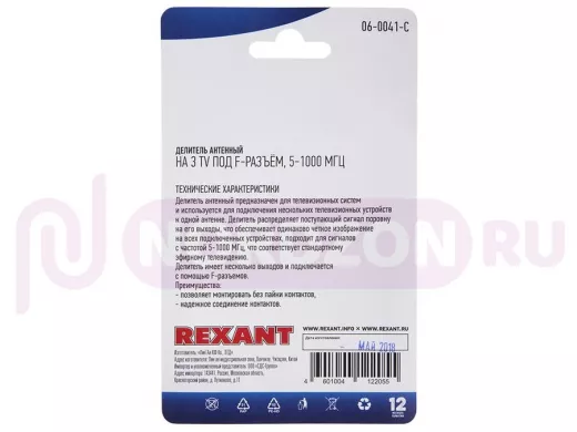 Заказать звонокДелитель антенный F-типа на 3 TV, 5-1000 МГц REXANT