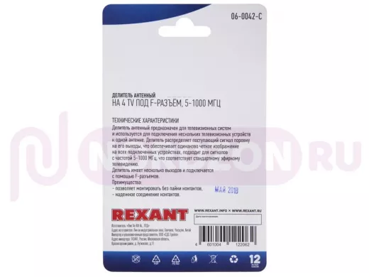 Заказать звонокДелитель антенный F-типа на 4 TV, 5-1000 МГц REXANT