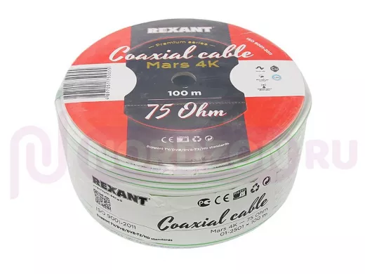 Кабель MARS 4K 75 Ohm REXANT. Состоит из центрального медного провода и металлической оплетки (экрана), разделенных между собой слоем диэлектрика (внутренней изоляции) и имеет общую внешнюю оболочку ПВХ (PVC). Кабель служит для передачи высокочастотных сигналов и имеет волновое сопротивление 75 Ом. Коаксиальные кабели, предназначенные для работы в СВЧ диапазоне, называются еще радиочастотными кабелями.