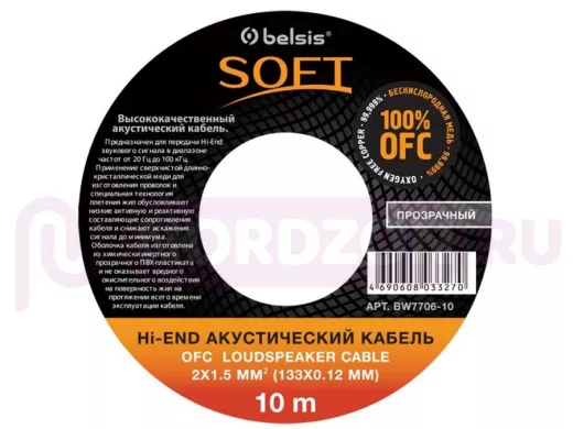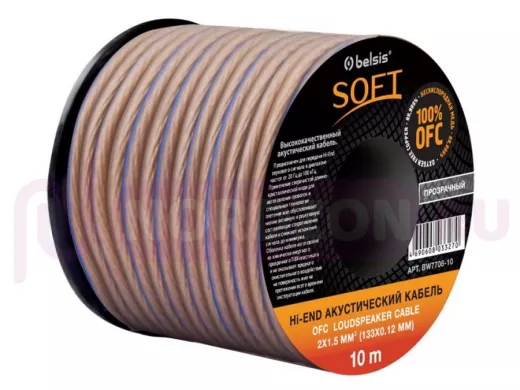 Акустический кабель 2х1,5 мм2 (15 GA) OFC, сверхмягкий прозрачный диэлектрик, на пластиковой катушкке