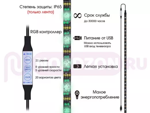 "ABBIKUS-126166" RGB светодиодная лента 1м, штекер USB, кнопка переключения