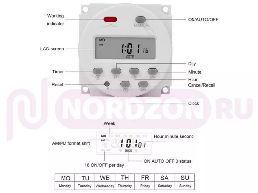 Реле времени недельное универсальное 220 Вольт 16 Ампер CN101A Таймер 24 часовой недельный предназначен для монтажа на плоскость. Встроенный перезаряжаемый аккумулятор для поддержки часов таймера. Предусмотрено 16 независимых программ включения выключения и 15 различных комбинаций дней работы.