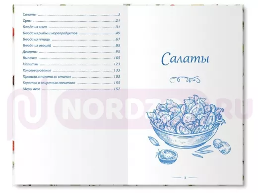 Справочная информация: правила этикета, правила потребления спиртных напитков, мера и масса продуктов. 10 разделов: салаты, супы, блюда из мяса, рыбы, птицы, овощей, десерты, выпечка, напитки, консервирование.
