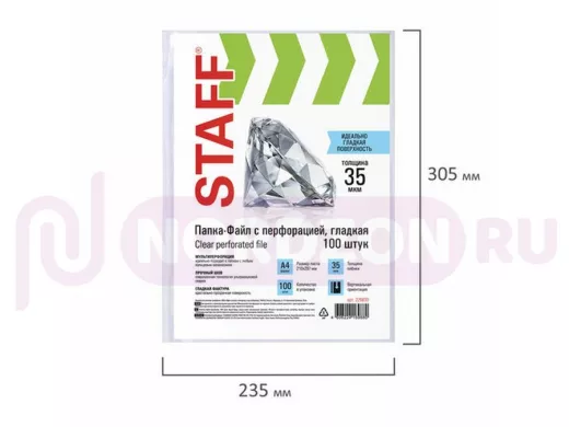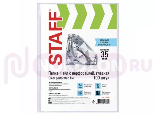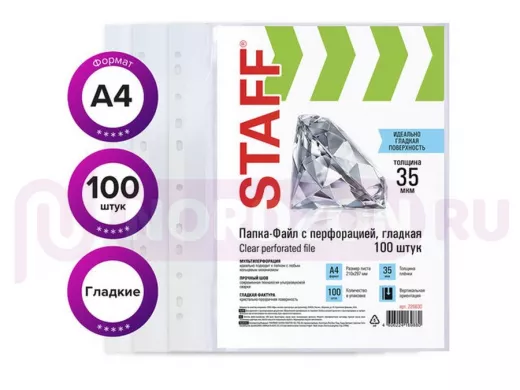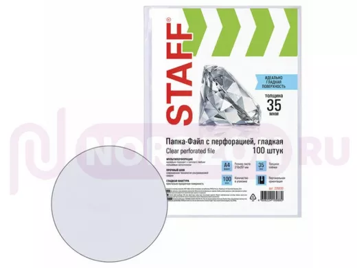 Перфопапки формата А4 с вертикальным размещением содержат универсальную перфорацию, а также имеют гладкую поверхность и прочные швы. Толщина пленки - 35 мкм, что подходит для хранения до 20 листов в 1 папке-файле. В комплекте 100 шт. Данный товар относится к эконом-сегменту. Перфорированные папки-файлы STAFF - один из самых востребованных офисных предметов, которые без труда можно приобрести в нашем интернет-магазине!
