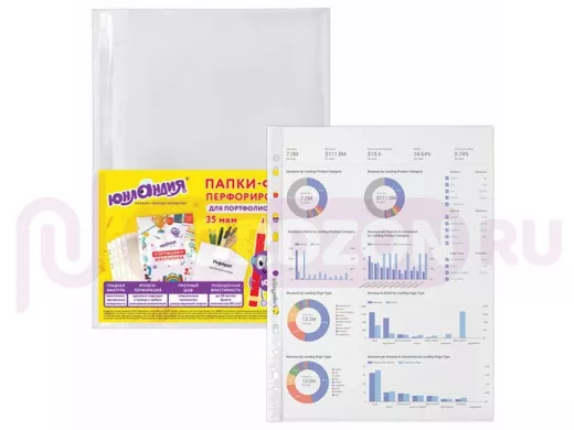 Перфорированные папки-файлы ЮНЛАНДИЯ предназначены для хранения документов в папке с любым кольцевым механизмом или скоросшивателем.