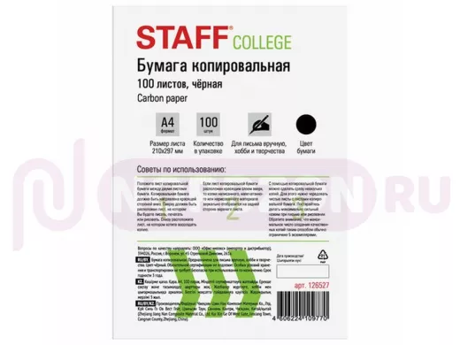 Имеет стандартный формат А4 и односторонний красящий слой черного цвета. Не пачкается. Может использоваться многократно. 100 штук в упаковке хватит на долгое время. Творите с радостью вместе с копировальной бумагой STAFF, которую можно приобрести в нашем интернет-магазине!