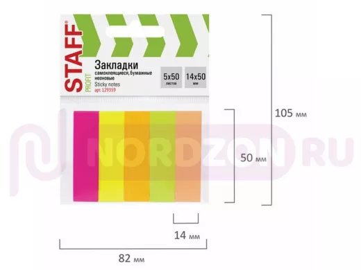 Набор бумажных закладок 5 неоновых цветов размером 50х14 мм состоит из 250 листов, по 50 закладок каждого цвета. Клейкий слой - 22 Н/м. Легко клеятся к любой поверхности и не оставляют следов. Материал закладок позволяет делать надписи ручкой и карандашом. Поставляются в полиэтиленовом пакете с европодвесом. Клейкие закладки STAFF помогут правильно организовать рабочее пространство. Выполнять повседневные задачи станет проще, чем когда-либо! Приобрести можно в нашем интернет-магазине.