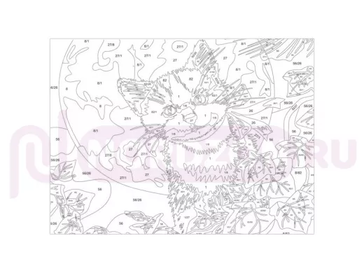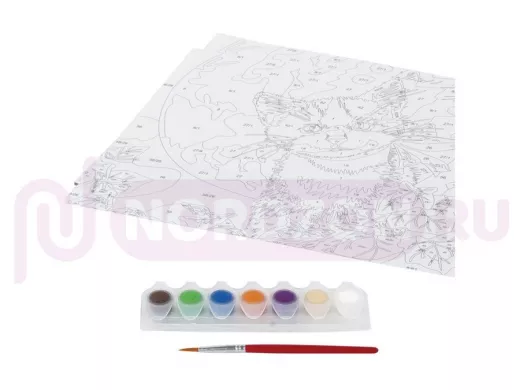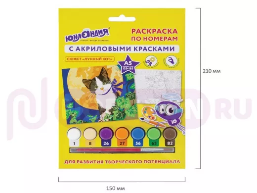 - Комплектация: акриловые краски, картон с нанесенным контуром, кисть, лист бумаги для тренировки