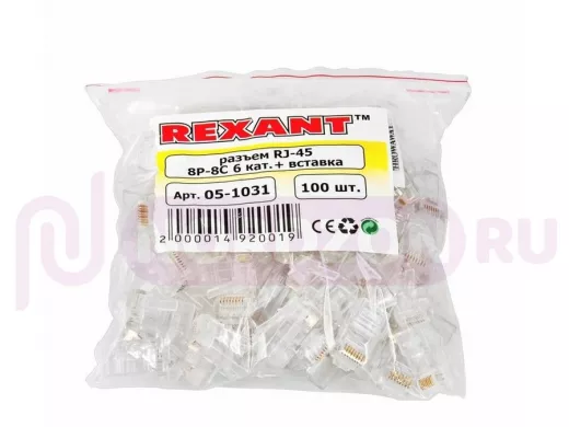 Джек RJ-45 8P8C CAT 6 (со вставкой) REXANT предназначен для соединения телекоммуникационного оборудования: компьютеры, офисные АТС, сетевые коммутаторы, концентраторы, коммутационные панели, маршрутизаторы, патч-панели, сетевые карты, а также другого оборудования, имеющего гнездо разъема 8P8C. Джек RJ-45 8P8C (англ. Registered jack) размещают на конце компьютерных или телефонных кабелей для соединения с розеткой, хабом, свитчем, сервером, модемом, роутером или другим компьютером. Штекер изготовлен из прозрачного качественного пластика и имеет 8 посадочных мест и 8 ножей-контактов. Данный джек имеет вставку, которая облегчает распиновку жил в разъеме. Такая вставка необходима при использовании кабеля с многопроволочными жилами. На контакты (ножи) нанесен слой технического золота 3тмкм для безупречной пропускной способности разъема. Частота пропускаемого сигнала у данного разъема категории 6 до 250 Гц. Для опрессовки разъема на кабеле необходим специальный обжимной инструмент.