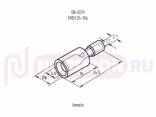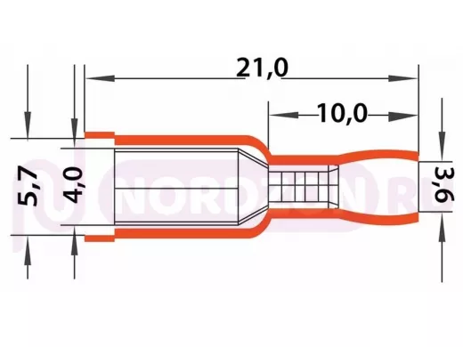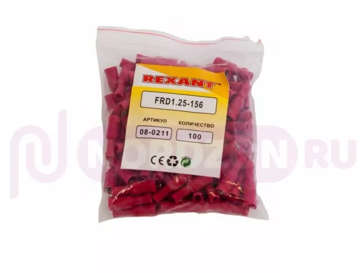 Изолированная штекерная клемма REXANT состоит из двух компонентов: металлического коннектора (гнездо) и защитного изолятора, закрывающего коннектор полностью. Металлический коннектор изготовлен из латуни, с поверхностным электролитическим лужением, а изолятор клеммы из поливинилхлорида (ПВХ), надежно защищающий место обжима кабеля и контактную часть от физических воздействий, а человека от поражения электрическим током. Обжатие производится специальными пресс-клещами (ht-301 H, ht-301 N, ht-301 W) поверх защитного изолятора. Цвет изолятора красный.