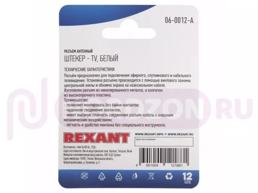 Заказать звонокРазъем антенный на кабель, (штекер-TV), белый, (1шт.) REXANT