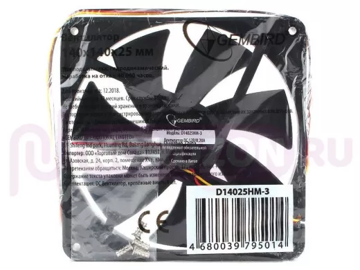 Вентилятор +12В; 140х140х25мм; Gembird, гидродинамический, 3 pin, провод 40 см