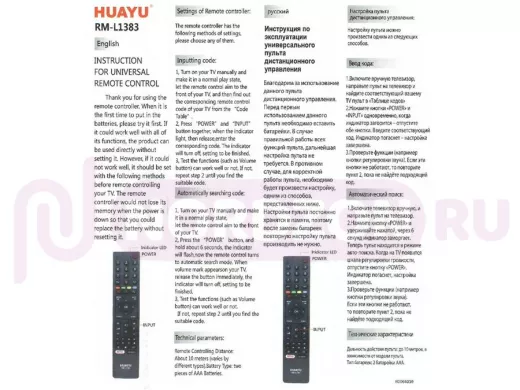 Пульт легко настраивается с помощью ввода кода, инструкция на русском языке и таблица с цветными изображениями поддерживаемых пультов в комплекте.