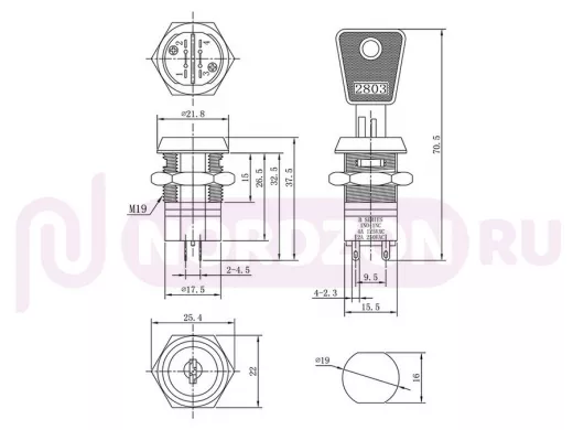 Выключатель ключ Ø19 250V 2А (4с) ON-ON предназначен для коммутации электрических цепей переменного тока напряжением 250В. Выключатель-ключ применяются в качестве комплектующих изделий различного электрооборудования (блоках питания, электроустановках на различных производствах, автомобилях, и многих других местах). Такой переключатель имеет два положения. Для переключения в нужное положение установите ключ (поставляется в комплекте) и приложите некоторые усилия на него. Монтаж осуществляется без применения винтов на плоских панелях толщиной от 0.8мм до 3мм. Подключение контактов осуществляется с помощью пайки.