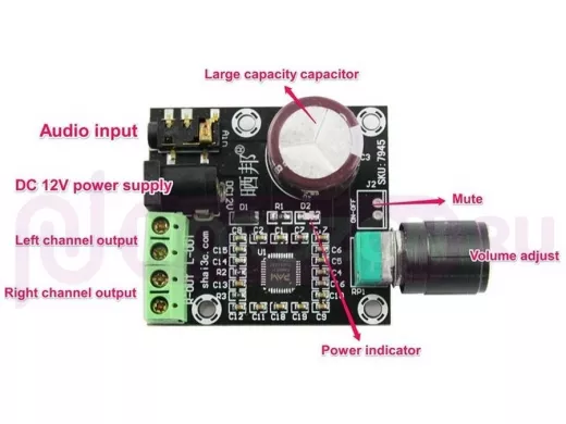 Цифровой Аудио Усилитель макс. 2*15 Вт PAM8610 питание 12 В с регулятором и разъёмами