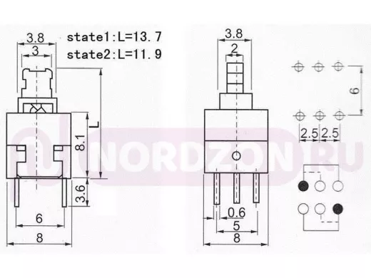 - Номинальная нагрузка: 0.3A 60 В переменного тока/1.5A 25 В переменного тока