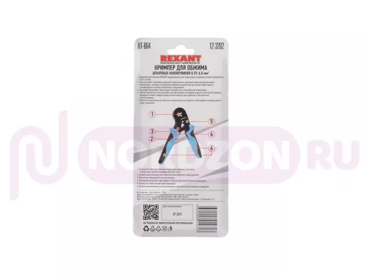 Кримпер для обжима штыревых клемм ht-864 REXANT предназначен для опрессовки штыревых клемм в диапазоне 0.25 - 6.0 мм2. Четырехсегментная саморегулирующая матрица с системой поворотных кулачков диафрагменного типа. Клещи имеют настройку давления опрессовки и принудительно размыкающуюся блокировку, которая не позволяет разойтись рукояткам до полной опрессовки, т.е. контролирует качество контактного соединения. Храповой механизм, гарантирует полный цикл качественной опрессовки. Корпус выполнен из высокопрочной закаленной инструментальной стали (сплав хрома и ванадия) и имеет закругленные линии корпуса для удобства и безопасного использования. Рукоятки выполнены из плотного синтетического покрытия, благодаря которому руки не будут скользить.