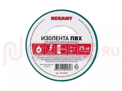 Изолента 19мм х 25м зеленая REXANT эластична - способна растягиваться на 150%, плохо рвется, устойчива к погодным явлениям, обладает высокими диэлектрическими свойствами и хорошей адгезией (скрепляет поверхности). Главными свойствами этого материла является способность герметизировать, защищать от влаги, слабых растворителей и солей.